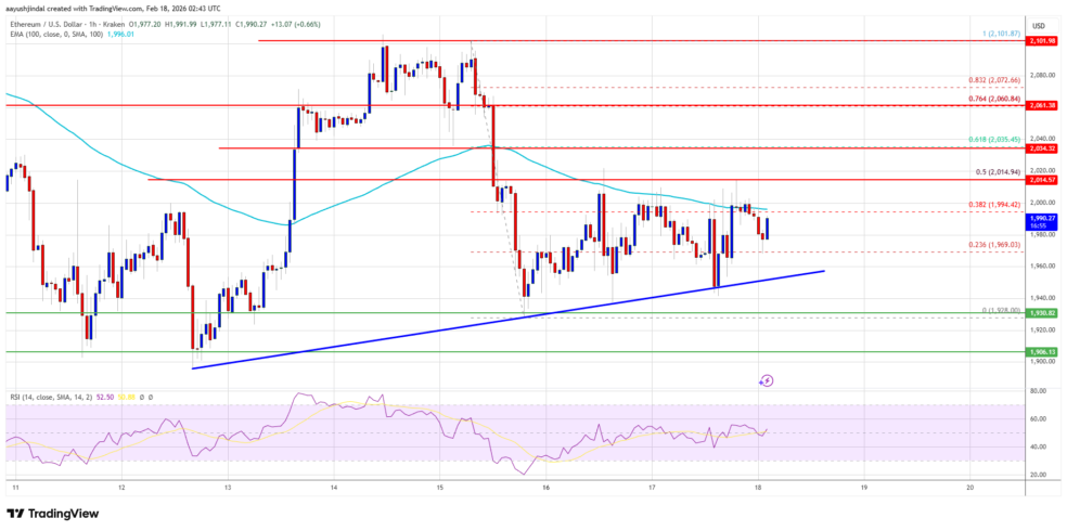 حرکتی به بالای مقاومت ۱٬۹۶۵ دلار رخ داد و قیمت حتی سطح اصلاحی ۵۰ درصد فیبوناچی از حرکت نزولی بین قله ۲٬۱۰۰ دلار تا کف ۱٬۹۲۸ دلار را آزمایش کرد. قیمت اتریوم اکنون زیر ۲٬۰۰۰ دلار و میانگین متحرک ساده ۱۰۰ ساعته معامله میشود. در همین حال، یک خط روند صعودی با حمایت در سطح ۱٬۹۵۵ دلار در نمودار ساعتی جفتارز ETH/USD در حال شکلگیری است.