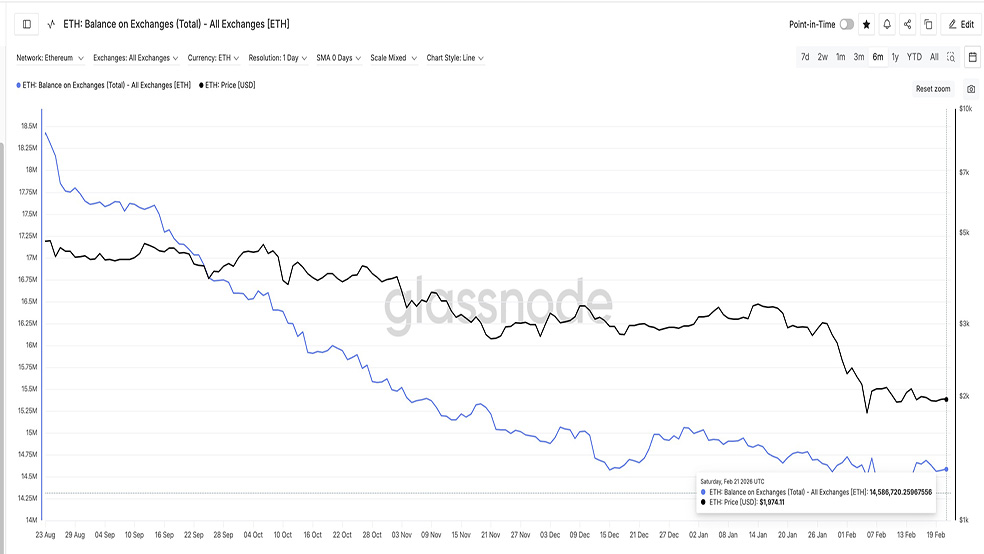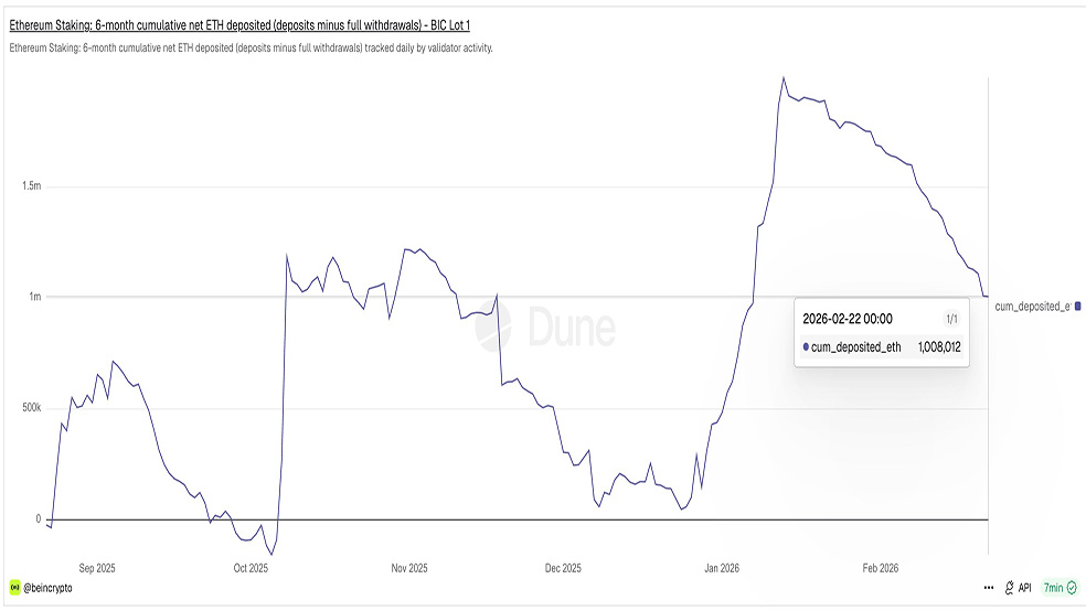 اما همزمان داده‌های استیکینگ تصویر متفاوتی ارائه می‌دهند. استیکینگ به معنای قفل‌کردن اتریوم در شبکه برای تأمین امنیت و دریافت پاداش است که عرضه در گردش را کاهش می‌دهد. با افت تقاضا برای استیکینگ، عرضه آزاد می‌تواند افزایش یابد و همزمان شدن این موضوع با عدم رشد حجم خرید اتریوم عاملی منفی برای قیمت خواهد بود. سپرده خالص تجمیعی ۶ ماهه از ۱,۹۹۴,۲۸۲ اتریوم در ۱۳ ژانویه به ۱,۰۰۸,۰۱۲ اتریوم در ۲۲ فوریه کاهش یافته که افتی نزدیک به ۵۰ درصدی محسوب می‌شود.
