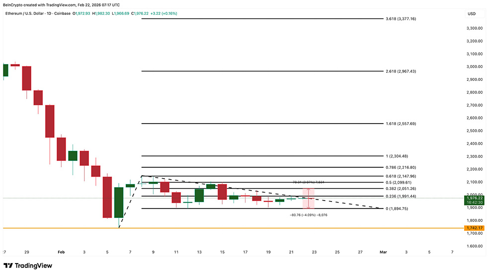 عملکرد قیمت اتریوم در روزهای اخیر چندان امیدوارکننده نبوده است. این رمزارز طی ۲۴ ساعت گذشته تقریباً بدون تغییر مانده و در مقیاس هفتگی بیش از ۵ درصد افت کرده است. با این حال، از ۱۹ فوریه تاکنون حدود ۴.۵ درصد رشد داشته که بخشی از آن به دلیل شکل‌گیری واگرایی صعودی در چارت روزانه است. در این الگو، قیمت کف پایین‌تری می‌سازد اما شاخص قدرت نسبی (RSI) کف بالاتری ثبت می‌کند؛ نشانه‌ای که معمولاً از تضعیف فشار فروش خبر می‌دهد. همین موضوع باعث شد اتریوم از کف ۶ فوریه در محدوده ۱,۷۴۰ دلار تا حوالی ۱,۹۷۰ دلار بازیابی شود.