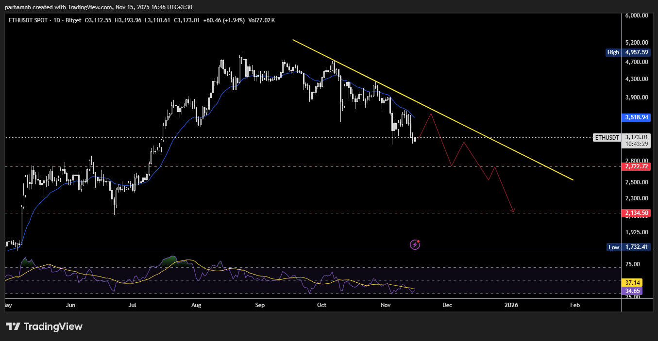 اتریوم اوایل این هفته خط روند صعودی چندماههی خود را به پایین شکست؛ خطی که از بهار امسال هر اصلاح قیمتی را حمایت میکرد. عدم بازگشت قیمت به محدودهی شکست نزدیک ۳,۵۰۰ دلار، بازار را در موضع تدافعی نگه داشته و خط روند نزولی که از اکتبر شکل گرفته، همچنان مانع هرگونه تلاش برای بازیابی است.