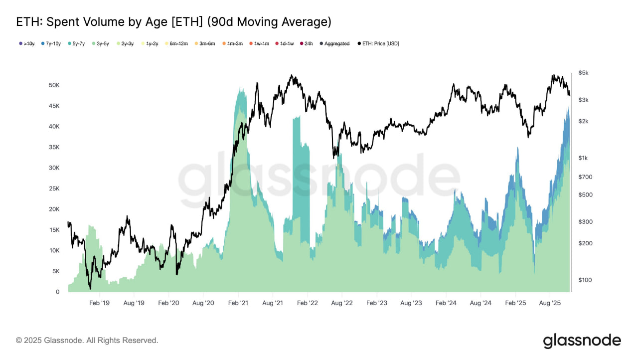 رفتار نهنگها لایهی دیگری به تصویر کلی بازار اضافه میکند. طبق دادههای گلسنود، هولدرهای ۳ تا ۱۰ سالهی اتریوم، خرج روزانهی خود را به بیش از ۴۵,۰۰۰ اتریوم رساندهاند؛ بالاترین سطح از فوریهی ۲۰۲۱ تاکنون.
