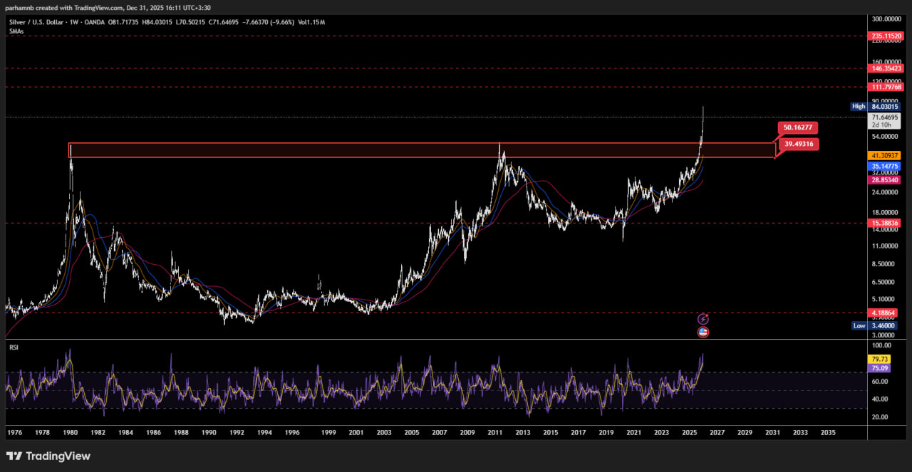 با توجه به نمودار هفتگی، نقره الان در حال اصلاح از سقف تاریخی خودش (۸۴ دلار) است. معمولاً بعد از چنین رشد تندی، اصلاح منطقی است. اگر قیمت به محدوده ۳۹ تا ۵۰ دلار برگردد، فرصتی طلایی برای خرید نقره خواهد بود. این ناحیه قرمز در نمودار، همان جایی است که قبلاً سقف بود و حالا به حمایت تبدیل شده.