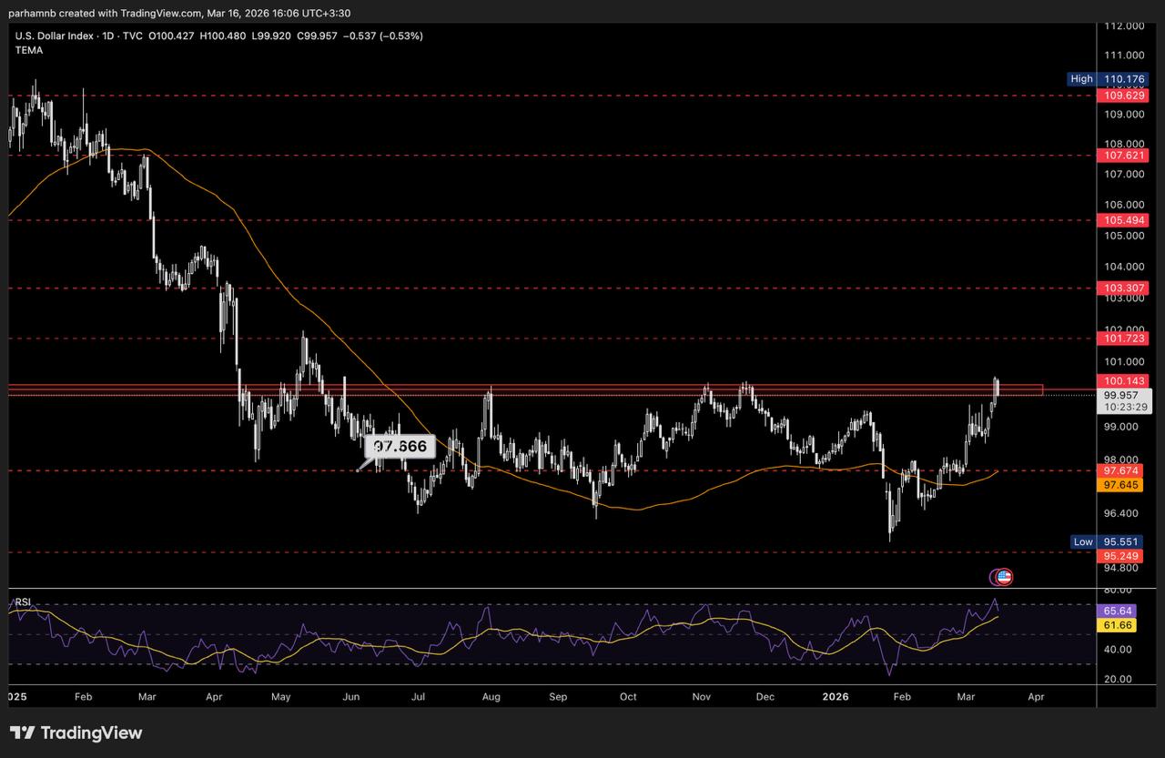 در بازار ارز نیز دلار از «تقاضای جنگ» بهره برده و شاخص دلار دوباره به سطح ۱۰۰ رسیده، عاملی که میتواند فشار مضاعفی بر طلا ایجاد کند.