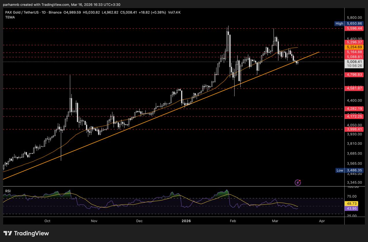 طلا برای دومین هفتهی پیاپی روندی کاهشی ثبت کرده و این اتفاقی است که از پاییز گذشته کمتر دیده شده بود. دو جمعه قبل، در آستانهی جنگ (۲۷ فوریه)، طلا روی ۵۲۹۶ بسته شد. سپس در هفتهی اول جنگ با افت خالص ۲.۲٪ به ۵۱۸۱ رسید. در هفتهی دوم هم افت دیگری معادل ۳.۱٪ ثبت کرد و در پایان هفته روی ۵۰۲۳ نشست.