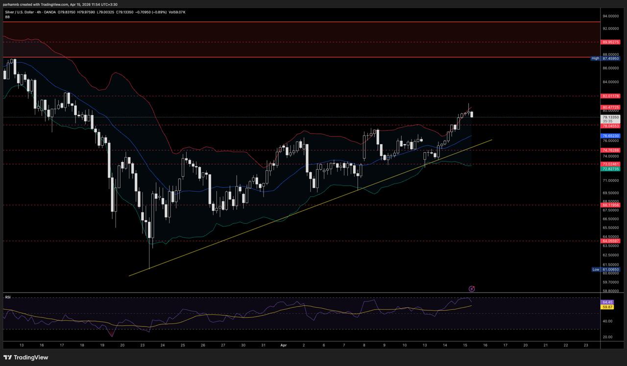 قیمت نقره نیز در نمودار ۴ ساعته شرایط مشابهی دارد. این فلز در حدود دو روز، بیش از ۶ دلار رشد کرده و حالا پس از ناتوانی در عبور از ۸۰ دلار، نشانههایی از ضعف نشان میدهد. شاحص RSI در اشباع خرید قرار گرفته و کندل اخیر با سایهی بلند از بالا، شباهت زیادی به الگوی بازگشتی دارد.