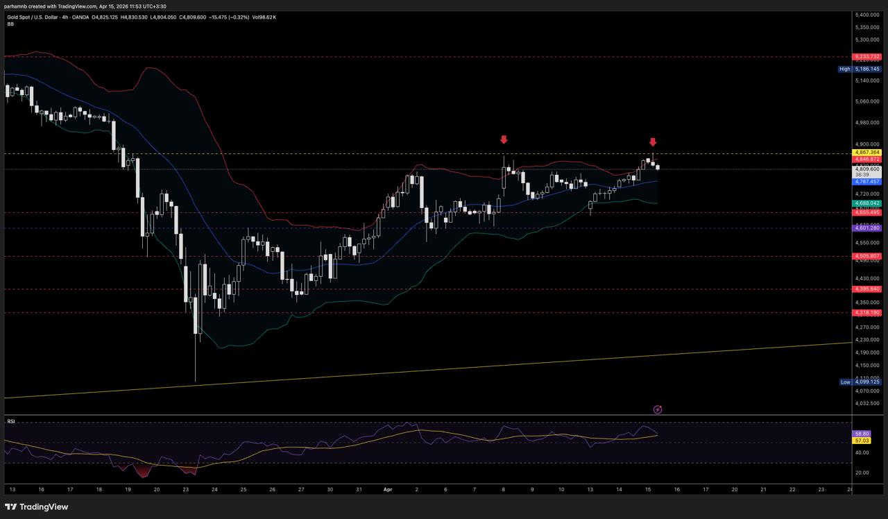 در نمودار ۴ ساعته، طلا بعد از جهشی بیش از ۲۰۰ دلار در کمتر از سه روز، بالای محدودهی مهم ۴۸۶۰ دلار متوقف شد. همزمان، شاخص RSI وارد ناحیهی اشباع خرید شد و قیمت بالاتر از باند بالایی بولینگر قرار گرفت؛ دو نشانهای که معمولا از داغ شدن بیش از حد بازار خبر میدهند.