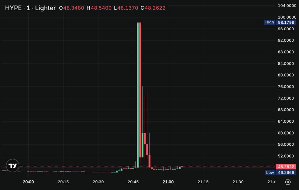 در ساعات گذشته، قیمت هایپر لیکویید ناگهان در صرافی Lighter از حدود ۴۸ دلار به حدود ۹۸ دلار جهش کرد – سپس خیلی سریع به سطح قبلی برگشت. این حرکت با انتشار اسکرینشاتهایی در شبکههای اجتماعی همراه بود که نشان میداد این رشد بیشتر ناشی از فعالیت رباتها بوده تا معامله واقعی.