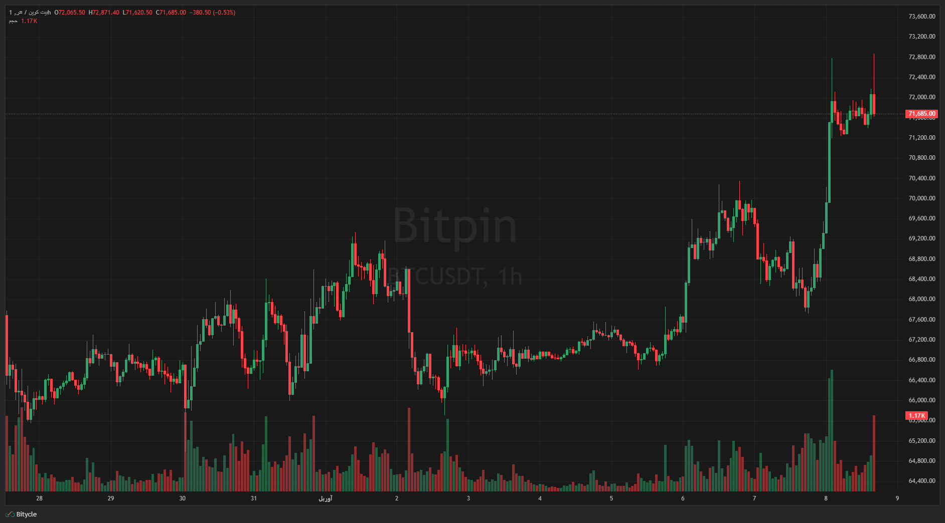 قیمت خرید بیت کوین در ۸ آوریل (۱۹ فروردین) از ۷۲٬۰۰۰ دلار عبور کرد و در زمان نگارش این گزارش با قیمت ۷۲٬۴۰۲ دلار معامله می‌شد. شاخص RSI به ۷۳٫۹۷ رسیده و به‌خوبی بالاتر از میانگین متحرک ساده ۵۰ روزه (50 SMA) در سطح ۶۹٬۸۴۳ دلار قرار دارد. این حرکت با آتش‌بس ایران آغاز شد و با رویدادی ساختاری‌تر ادامه یافت.