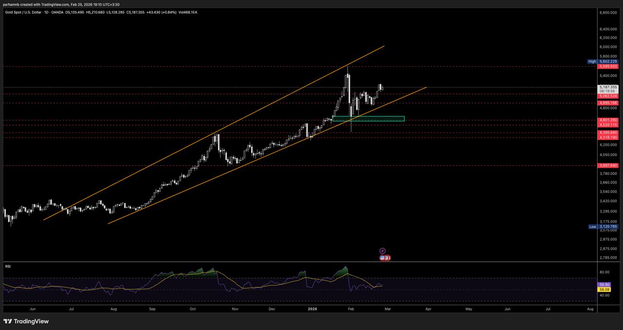 از نظر تحلیل تکنیکال، قیمت طلا در تایم‌فریم روزانه همچنان در کانالی صعودی در حال حرکت است، اما در کوتاه‌مدت با مقاومت استاتیک ۵٬۲۳۳ دلاری درگیر شده و زیر این محدوده نوسان می‌کند. با وجود این درگیری قیمت، قدرت صعودی (مومنتوم) بازار بسیار بالا ارزیابی می‌شود.