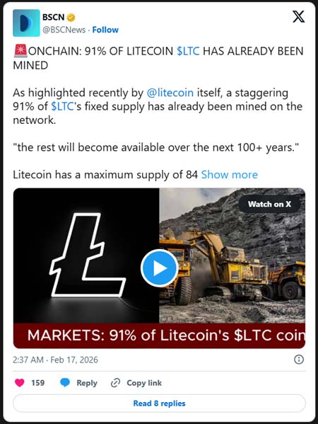 در همین حال، تا فوریه ۲۰۲۶ (بهمن ۱۴۰۴)، لایت کوین به نقطه عطف مهمی در زنجیره موجودی خود رسیده است. تقریباً ۹۱ درصد از کل موجودی قبلاً استخراج شده است. موجودی کل شبکه به ۸۴ میلیون کوین محدود شده و این بخش بزرگ از موجودی قبلاً به دست آمده است.