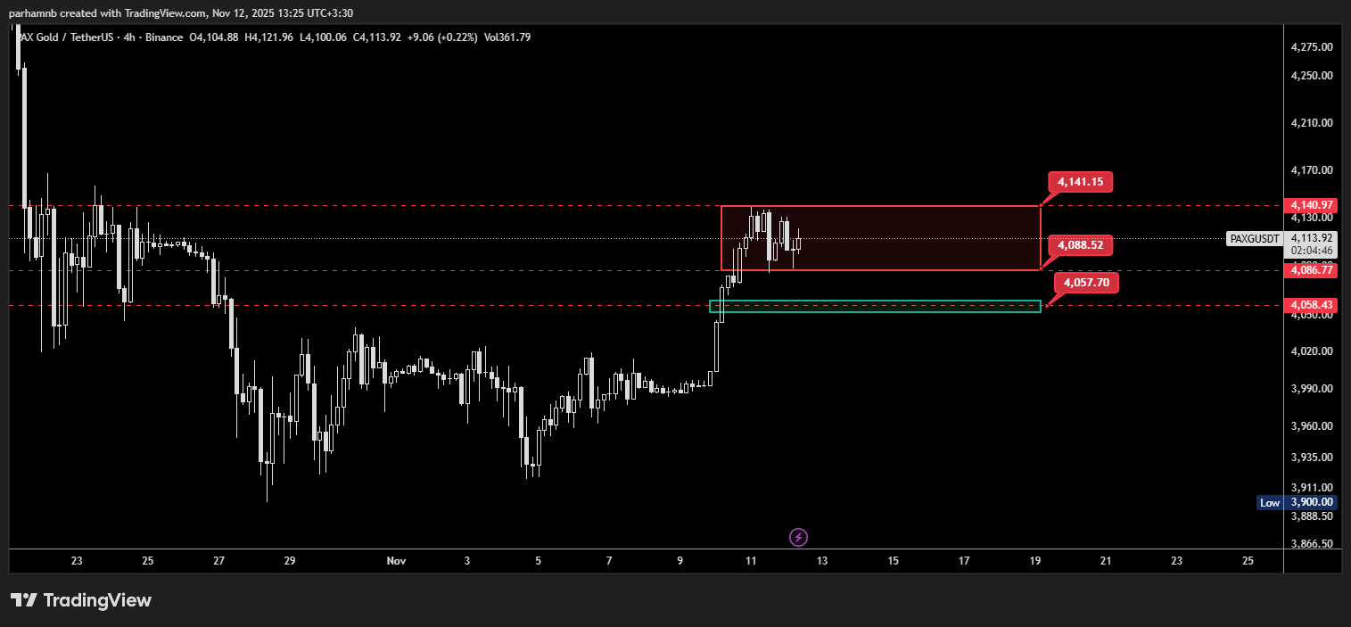 در تایم فریم ۴ ساعته مشاهده میشود که پکس گلد در محدودهای بین ۴۰۸۸ تا ۴۱۴۱ دلار در نوسان است. این ناحیه نوعی باکس خنثی ایجاد کرده که معمولاً پیشزمینهی حرکتهای قوی بعدی است. در صورتی که قیمت بتواند از سقف این محدوده یعنی ۴۱۴۱ دلار عبور کند، احتمال رشد تا مقاومت روزانه ۴۴۰۳ دلار افزایش مییابد.