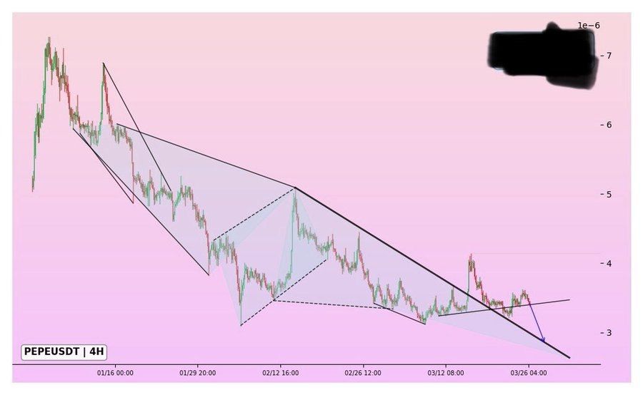 همانطور که تحلیلگر پپه ویل (Pepe Whale) اشاره کرده، بازگشت شکننده قیمت به سرعت در حال محو شدن است. پپه همچنان به ساختار نزولی در نمودار ۴ ساعته پایبند است و هر رالی در نزدیکی خط روند نزولی با مقاومت مواجه میشود. قیمت اخیراً در بازپسگیری محدوده ۰٫۰۰۰۰۰۳۳۵ تا ۰٫۰۰۰۰۰۳۴۵ دلار ناکام ماند. این رد شدن، نشانهای از مومنتوم ضعیف خرید است. ساختار فعلی نشان میدهد که روند نزولی ادامه خواهد یافت، مگر اینکه خریداران سریعاً وارد عمل شوند. شکست به زیر ۰٫۰۰۰۰۰۳۲۰ دلار میتواند فشار نزولی را تشدید کند.