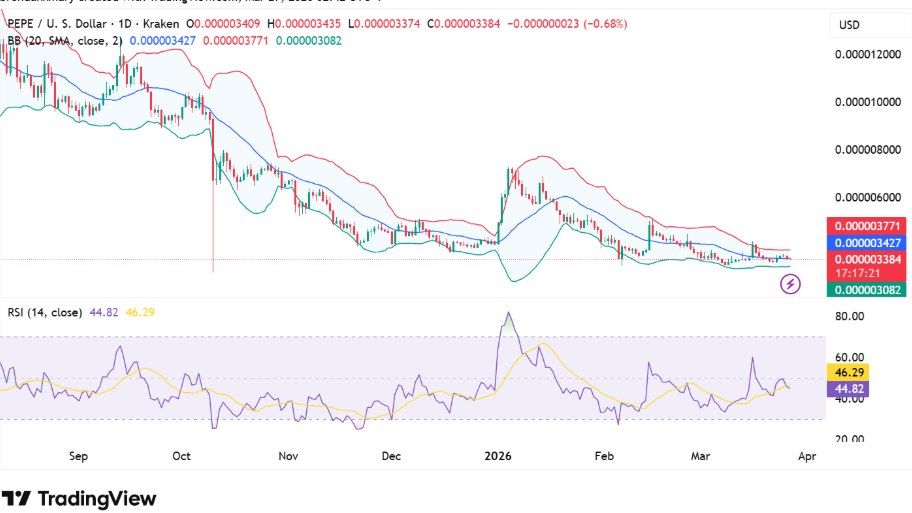 باندهای بولینگر (Bollinger Bands) کاهش نوسان قیمت را نشان میدهند. قیمت به باند پایینی در نزدیکی ۰٫۰۰۰۰۰۳۰۸ دلار چسبیده که نشانه فشار فروش مداوم است. باند میانی در محدوده ۰٫۰۰۰۰۰۳۴۲ دلار همچنان به عنوان مقاومت پویا عمل میکند و تلاشهای صعودی را محدود کرده است.