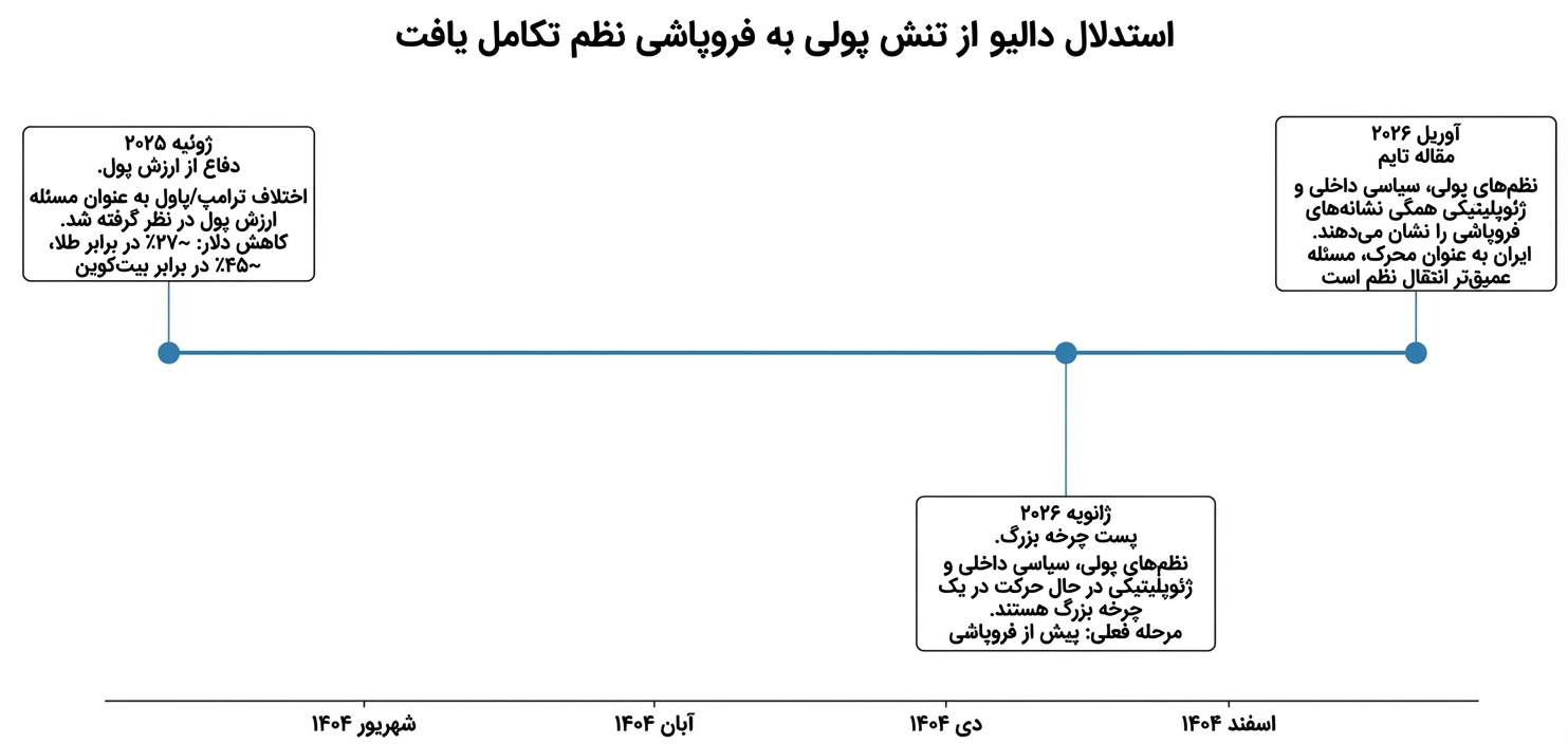 در همان مقاله، او اشاره کرد که دلار از تابستان قبل حدود ۲۷ درصد در برابر قیمت طلا و ۴۵ درصد در برابر بیت کوین افت کرده است. دالیو در پست لینکدین ژانویه ۲۰۲۶ (دی ۱۴۰۴) خود استدلال کرد که نظمهای پولی، سیاسی داخلی و ژئوپلیتیکی بینالمللی همگی در یک چرخه بزرگ واحد حرکت میکنند. فاز کنونی نشاندهنده گذار پیش از فروپاشی است.