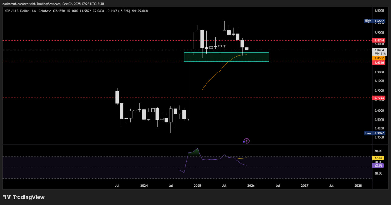 ترکیب دادههای تکنیکال از واگرایی روزانه، حفظ حمایت کلیدی ۱.۷۵ دلاری، شکست مقاومتهای میانمدت و سیگنالهای صعود ماهانه، همگی نشان میدهد XRP در حال نزدیکشدن به فاز جدیدی از احتمال ریکاوری است. گرچه همچنان باید توجه داشت که سطح ۱.۷۵ دلار در تایم ماهانه به هیچ عنوان نباید از دست برود و RSI باید بالای کف فعلی باقی بماند تا سناریوی صعودی پابرجا باشد. در سناریوی افزایشی، هدف کوتاهمدت قیمت حرکت به بازه ۲.۱۰ تا ۲.۱۵ دلار اعلام میشود و عبور از این سطوح میتواند جرقه مرحله جدید رشد باشد.
