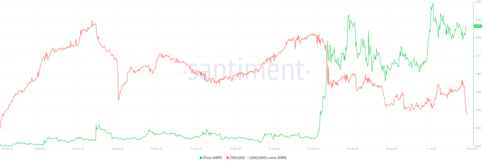 رفتار سرمایهگذاران بزرگ XRP در هفتههای اخیر تغییرات مهمی داشته است. بر اساس دادههای آنچین، نهنگهایی که بین ۱۰۰ هزار تا ۱ میلیون XRP در اختیار دارند، طی تنها ۱۰ روز گذشته بیش از ۱۰۰ میلیون توکن فروختهاند – که باعث شده مجموع ذخایر آنها به پایینترین سطح در ۳۴ ماه گذشته برسد؛ رقمی که حدود ۳۰۰ میلیون دلار ارزش دارد.