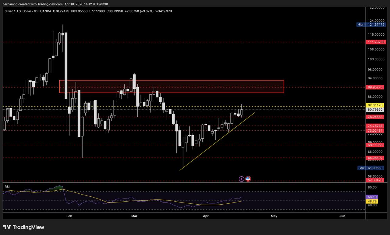 از نظر تکنیکال، قیمت نقره در تایمفریم روزانه پس از برخورد به محدوده ۶۱ دلار در تاریخ ۲۳ مارس ۲۰۲۶ با افزایش قدرت خریداران مواجه شد و وارد یک روند صعودی پایدار شد.