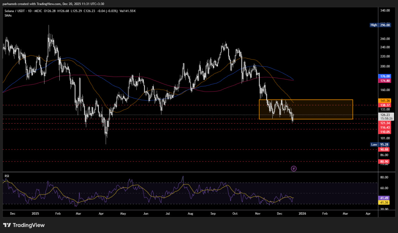 با بررسی نمودار قیمت سولانا، میتوان اولین سطح حمایتی این رمزارز را نزدیک به قیمت فعلی، یعنی حوالی ۱۲۵ دلار در نظر داشت. بعد از آن محدودهی حساس ۱۲۱ تا ۱۲۰ دلار قرار دارد و پایینتر هم ناحیهی حمایتی مهمی در حوالی ۱۱۰ دلار دیده میشود. بازار همچنین یک کف ۸ ماهه نزدیک ۱۱۶.۹ دلار ثبت کرده و بسته شدن کندل هفتگی زیر این سطح میتواند مسیر را به سمت سطوح پایینتر هموار کند.