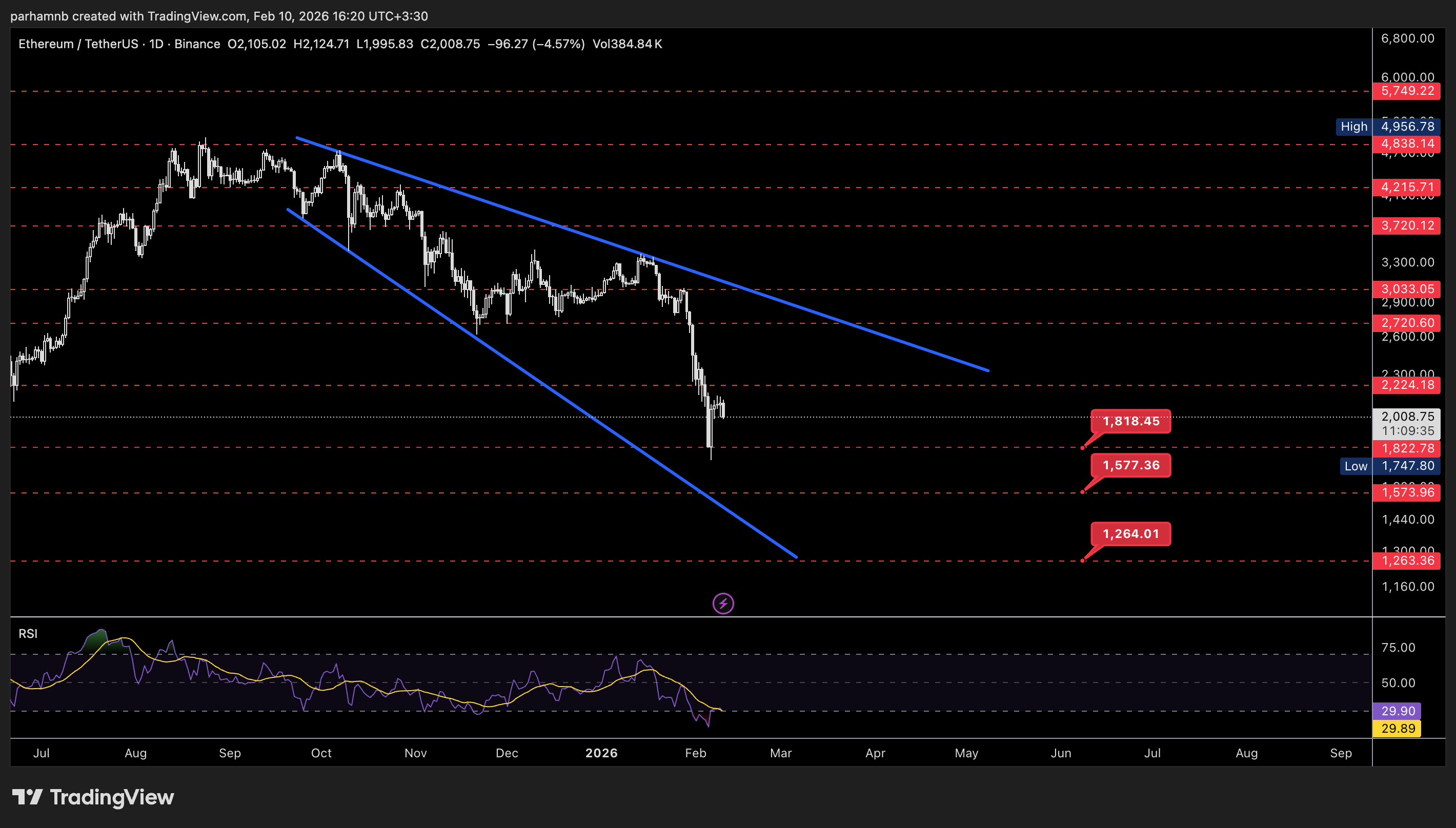 با توجه به قیمت اتریوم در تایم‌فریم روزانه می‌بینیم که در یک الگوی باز شونده‌ی نزولی در حال حرکت است و در میانه‌ی این الگو قرار دارد. اتریوم از محدوده‌ی نزدیک به کف این الگو یعنی حمایت ۱۸۱۸ دلاری برگشت داشته است که این واکنش نشان‌دهنده‌ی حضور خریداران در سطوح پایین است.