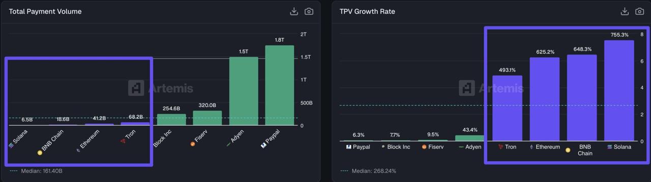 در حوزه‌ی پرداخت‌ها نیز سولانا ۷۵۵ درصد رشد کرد، در حالی که اتریوم ۶۲۵ درصد رشد داشت. این آمار نشان می‌دهد که پذیرش بلاکچین‌ها در حوزه‌ی پرداخت‌ها با سرعت بالایی در حال افزایش است.