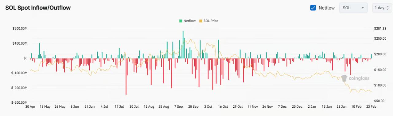 نت‌فلو SOL در صرافی‌ها هم متغیر مهمی است. اواخر ۲۰۲۵ و اوایل ۲۰۲۶، ورود به صرافی‌ها از خروجی‌ها بیشتر بود؛ موضوعی که معمولا می‌تواند نشانه‌ی افزایش احتمال فروش باشد (انتقال از کیف پول شخصی به صرافی). با این حال، در هفته‌های اخیر روند تغییر کرده و خروجی‌ها از ورودی‌ها پیشی گرفته‌اند. تغییری که گاهی می‌تواند فشار فروش را کمتر کند.