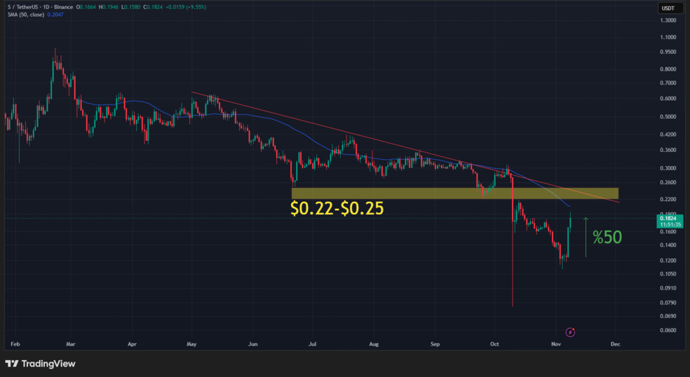 - قیمت S طی چند روز بیش از ۵۰٪ از کف خود رشد کرده، اما همچنان زیر خط روند نزولی بلندمدت قرار دارد.