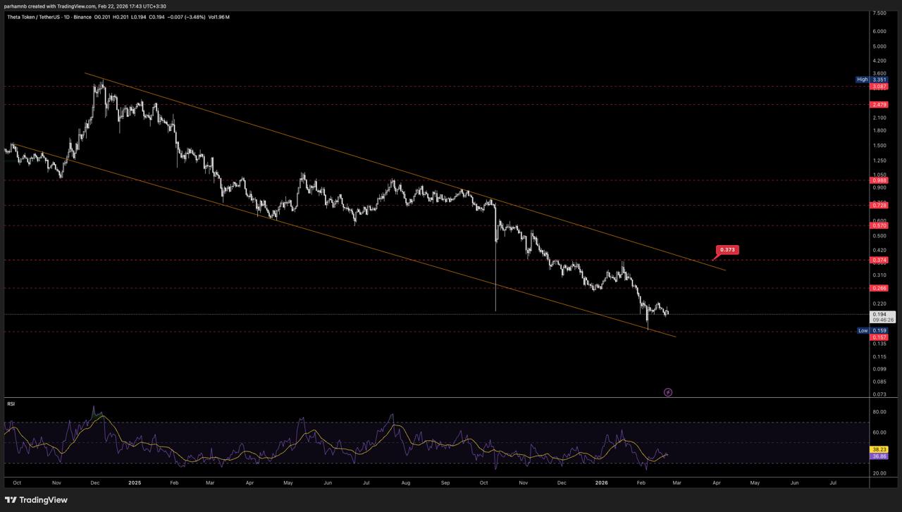 سناریوی منطقی برای THETA در کوتاهمدت، ادامهی نوسانات رنج بالای کف کانال است. در صورت تأمین نقدینگی کافی و حفظ ساختار، حرکت به سمت مقاومت ۰.۳۷ دلار محتمل خواهد بود.
