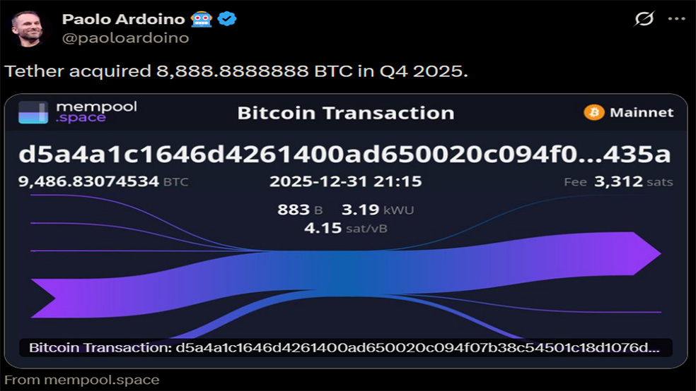 بر اساس اعلام پائولو آردوینو (Paolo Ardoino)، مدیرعامل شرکت تتر (Tether)، میزان خرید بیت کوین توسط این شرکت در سهماهه چهارم سال ۲۰۲۵ حدود ۸٬۸۸۸ واحد بوده است. با این حال، دادههای آنچین نشان میدهد مجموع خرید تتر در این بازه به حدود ۹٬۸۵۰ بیت کوین رسیده که ارزشی نزدیک به ۸۷۶ میلیون دلار در قیمتهای آن زمان داشته است.