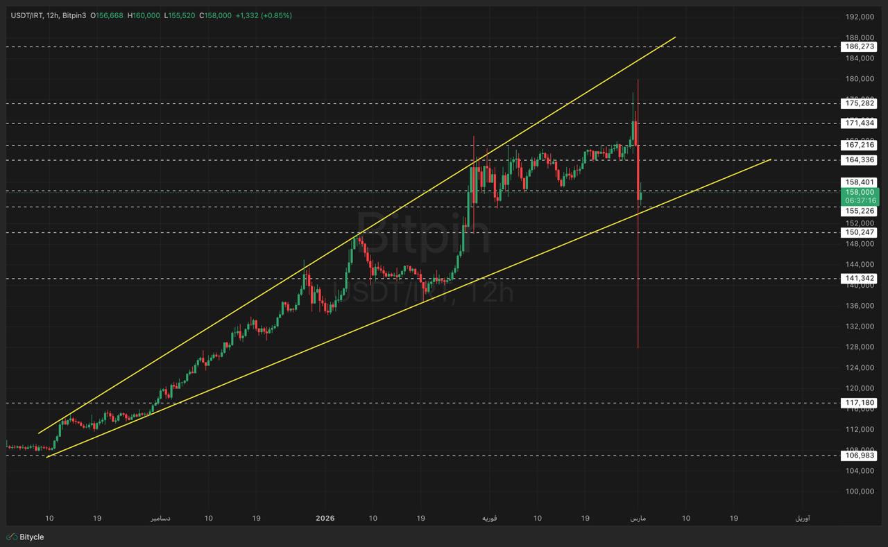 در تایمفریم ۱۲ ساعته تتر/تومان، قیمت پس از رسیدن به اهداف مشخصشده نتوانست به تارگت ۱۸۶ هزار تومان دست پیدا کند و با برخورد به محدوده ۱۷۸ هزار تومان وارد یک ریزش تند و هیجانی شد. نتیجه این حرکت، افزایش محسوس نوسانات و سختتر شدن پیشبینی مسیر کوتاهمدت بازار است.