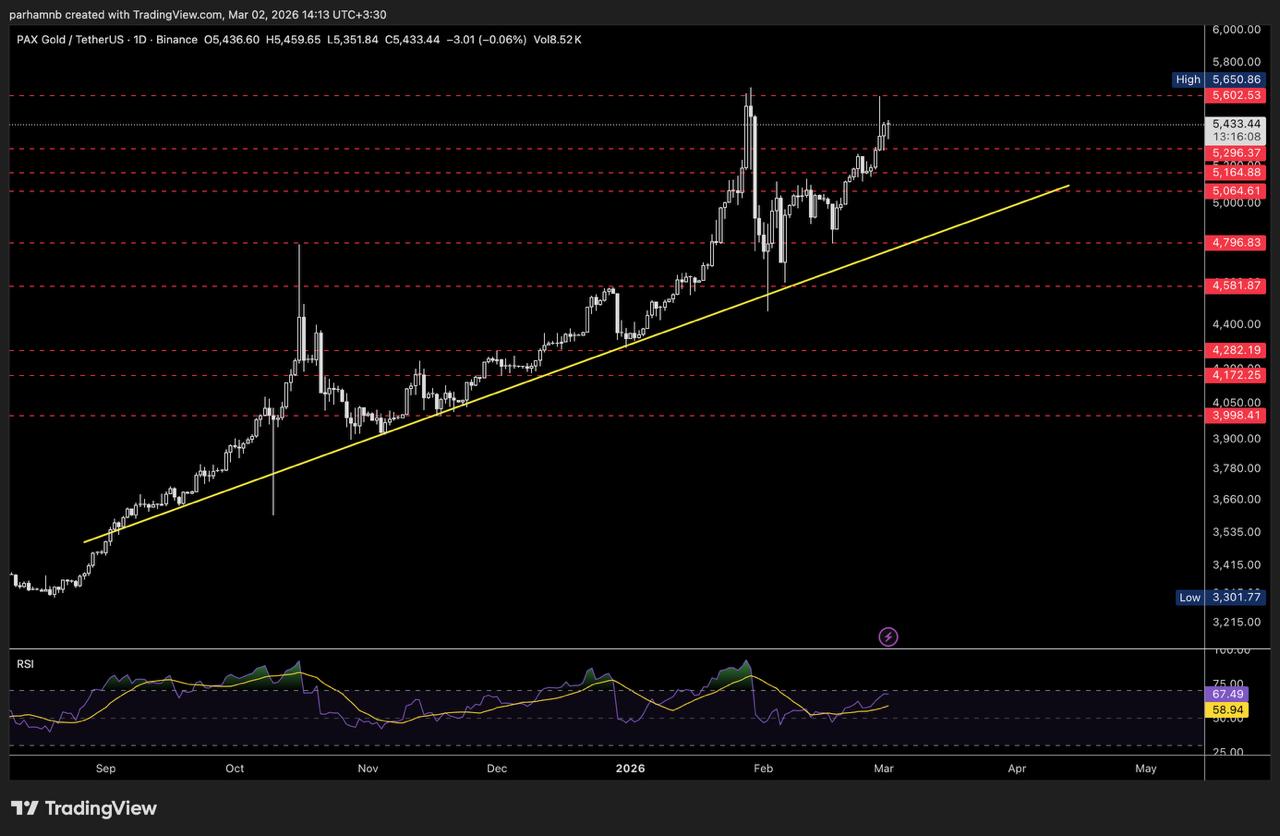 در حال حاضر محدوده ۵۶۰۰ دلاری به عنوان یک مقاومت بسیار مهم برای طلای دیجیتال عمل میکند و تا زمانی که قیمت زیر این سطح در نوسان باشد، احتمال رنج و اصلاح به سمت حمایتهای پایینتر وجود دارد.