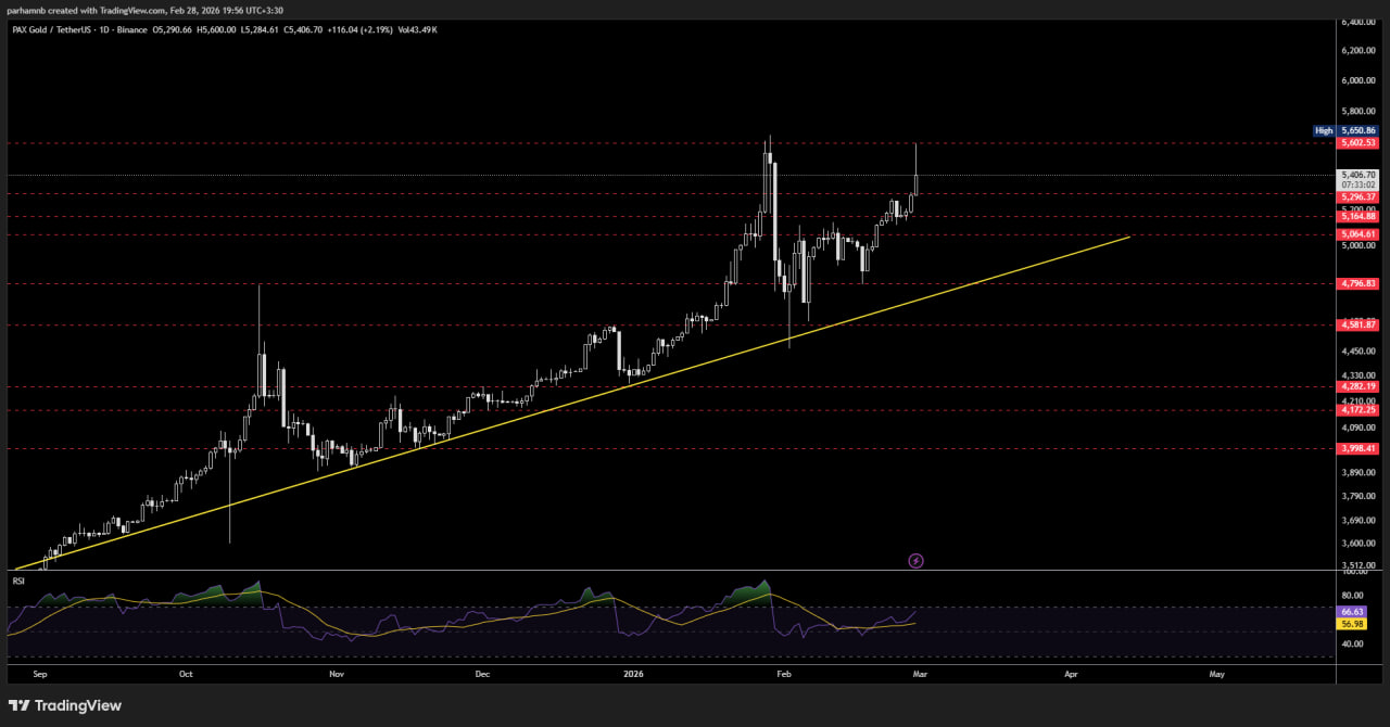 با بررسی نمودار روزانه طلای دیجیتال، میبینیم قیمت پس از رالی قدرتمند تا محدوده سقف قبلی خود در حوالی ۵۶۰۰ دلار رشد کرد و بعد از برخورد به این ناحیه، اکنون در محدوده ۵۴۰۰ دلار در حال نوسان است. این حرکت همزمان با اوجگیری تنشهای ژئوپلیتیک میان ایران، اسرائیل و آمریکا رخ داده. در حالی که امروز شنبه است و بازار اونس جهانی طلا عملاً تعطیل بوده، بنابراین بخش قابل توجهی از این جهش را میتوان به فومو و جو احساسی ناشی از اخبار درگیریها نسبت داد و منتظر واکنش واقعی بازار با بازگشایی معاملات جهانی ماند.