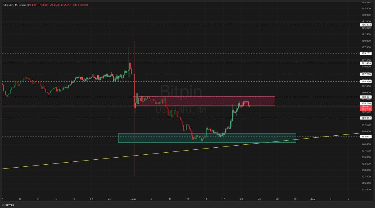 در تایم ۴ ساعته، قیمت به زون مقاومتی ۱۵۵ تا ۱۵۸ هزار تومان رسیده و در این ناحیه، کاهش مومنتوم نزولی و کندلهای نزولی دیده میشود. اگر قیمت نتواند بالای این ناحیه تثبیت شود، احتمالاً اصلاحی به سمت سطوح پایینتر و ناحیه حمایتی ۱۵۰ هزار تومان رخ میدهد. این ساختار تکنیکال نشان میدهد که تتر در بازار ایران در حال تشکیل یک زون رنج جدید در محدوده ۱۴۰ تا ۱۶۰ هزار تومان است.