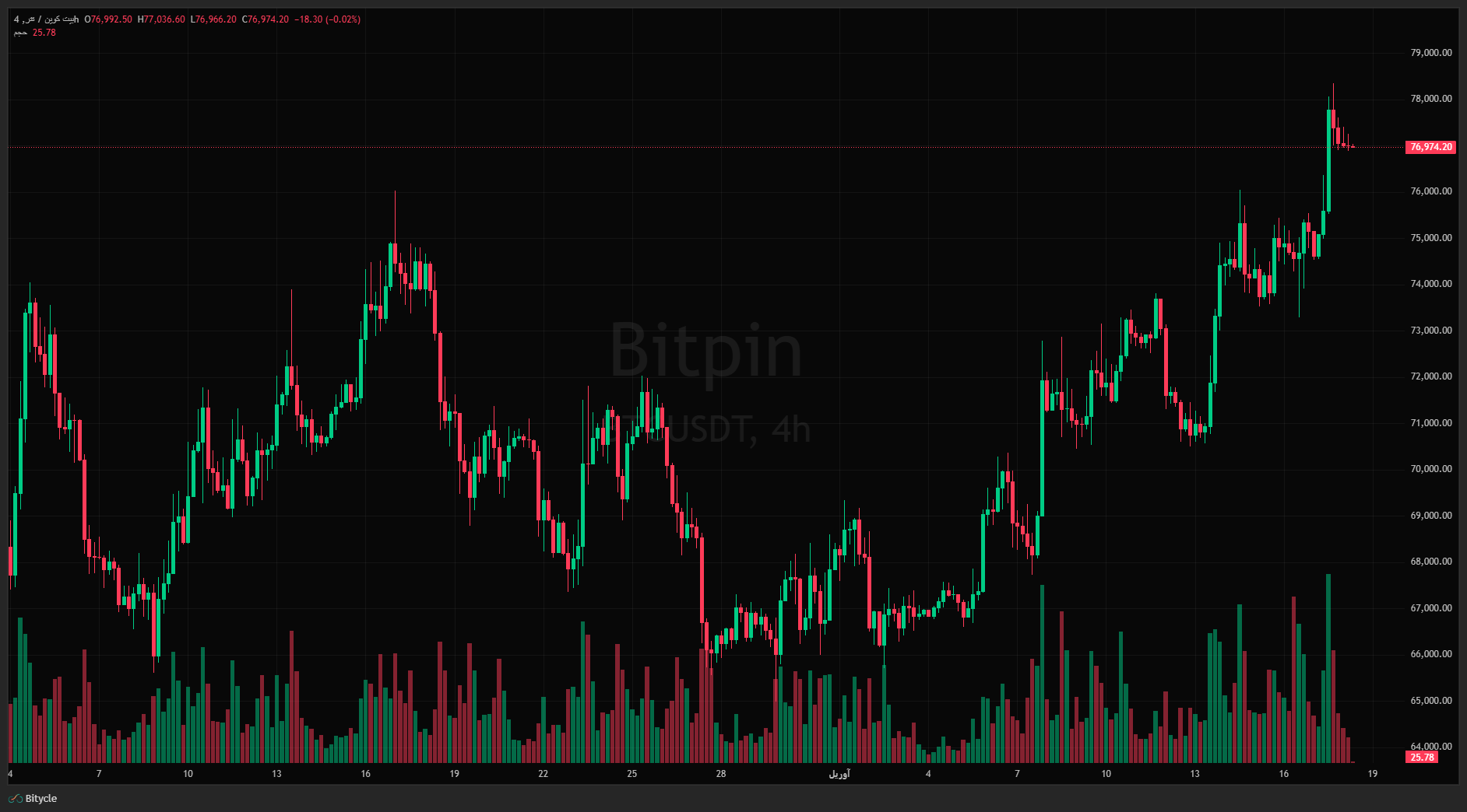 این رمزارز در ساعات بعدی اصلاح شد و اکنون اندکی بالاتر از ۷۷٬۰۰۰ دلار معامله می‌شود. با توجه به اینکه تمام این سودها به کاهش ظاهری تنش‌ها در خاورمیانه نسبت داده شده، در صورت اثبات صحت ادعاهای ایران، روند صعودی ممکن است به زودی متوقف شود.