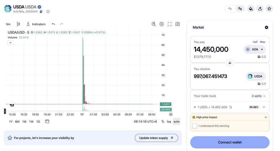 بر اساس تحقیق ZachXBT، این نهنگ که مقادیر زیادی ADA در اختیار داشت، تصمیم گرفت ۱۴.۴ میلیون توکن کاردانو (به ارزش حدود ۶.۹ میلیون دلار در زمان معامله) را به استیبل‌کوین USDA (استیبل‌کوین پگ شده به دلار در شبکه کاردانو) تبدیل کند. این عملیات تبدیل در یک استخر نقدینگی که توانایی جذب این حجم از سفارش را نداشت، صورت گرفت.