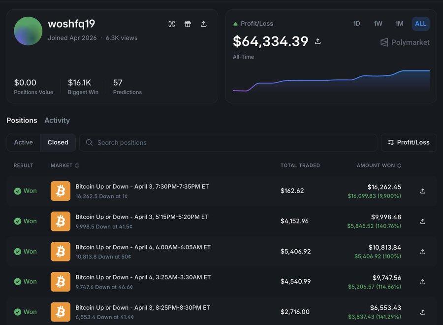 داده‌های پلی‌مارکت (Polymarket) نشان می‌دهد که این ربات با نام کاربری «woshfq19» در تنها چهار روز فعالیت، حدود ۶۴٬۳۳۴ دلار سود کل کسب کرده است. استراتژی این ربات بر قراردادهای کوتاه‌مدت «صعود یا نزول» مرتبط با بیت کوین (BTC) متمرکز بود؛ قراردادهایی که هر کدام تنها پنج دقیقه طول می‌کشیدند.