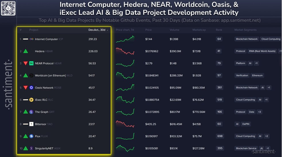 در صدر این لیست، پروژهی Internet Computer (ICP) با امتیاز حدود ۲۹۱.۲۳ قرار دارد. در جای بعدی، هدرا (HBAR) با امتیاز ۲۲۶.۰۳ قرار گرفته است. سایر پروژههای این فهرست عبارتاند از: نیر پروتکل (NEAR) با ۵۶.۵۳، ورلد کوین (WLD) با ۵۴.۱۷، Oasis Network (ROSE) با ۴۵.۱۷، iExec RLC (RLC) با ۳۴.۴۷، گراف (GRT) با ۲۶.۴۷، Bittensor (TAO) با ۲۳.۱۷، Flux (FLUX) با ۲۰.۴۷ و SingularityNET (AGIX) با ۸.۹ امتیاز ثبت شدهاند.