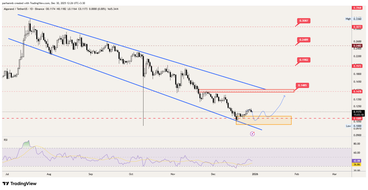 نمودار روزانه نشان میدهد قیمت درون الگوی نزولی در حال نوسان است، اما اخیراً به محدوده حمایتی کلیدی ۰.۱ دلار رسیده است. با حفظ این حمایت مهم و جمعآوری نقدینگی، انتظار میرود ALGO به سمت سقف کانال در ناحیه ۰.۱۴ دلار حرکت کند و پس از شکست، به سطوح بالاتر دست یابد. در مجموع ادغام الگورند با صنایع دنیای واقعی، جایگاه این شبکه را برای بلندمدت تضمین میکند.