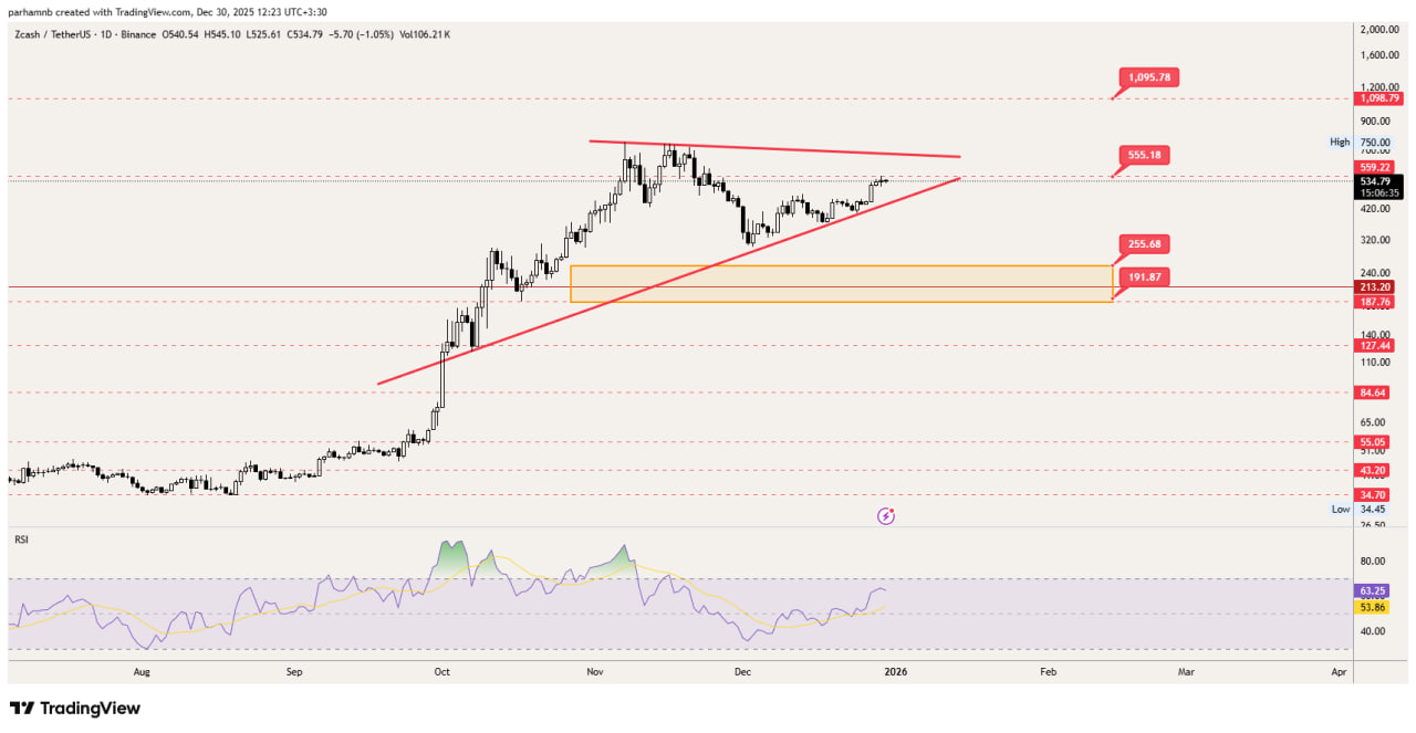نمودار روزانه نشان میدهد قیمت پس از روند صعودی قدرتمند، اکنون درون یک الگوی فشردگی در حال نوسان است. با حفظ حمایت کلیدی در محدوده ۱۹۱ تا ۲۵۵ دلار، زیکش میتواند به سمت اهداف بالاتر مثل ۵۵۵ دلار و حتی ۱۰۹۵ دلار حرکت کند. همچنین آمارها نشان میدهد تعداد توکنهای ZEC نگهداری شده در آدرسهای محافظتشده در سال ۲۰۲۵ تقریباً سه برابر شده که نشانه تغییر رفتار کاربران است.