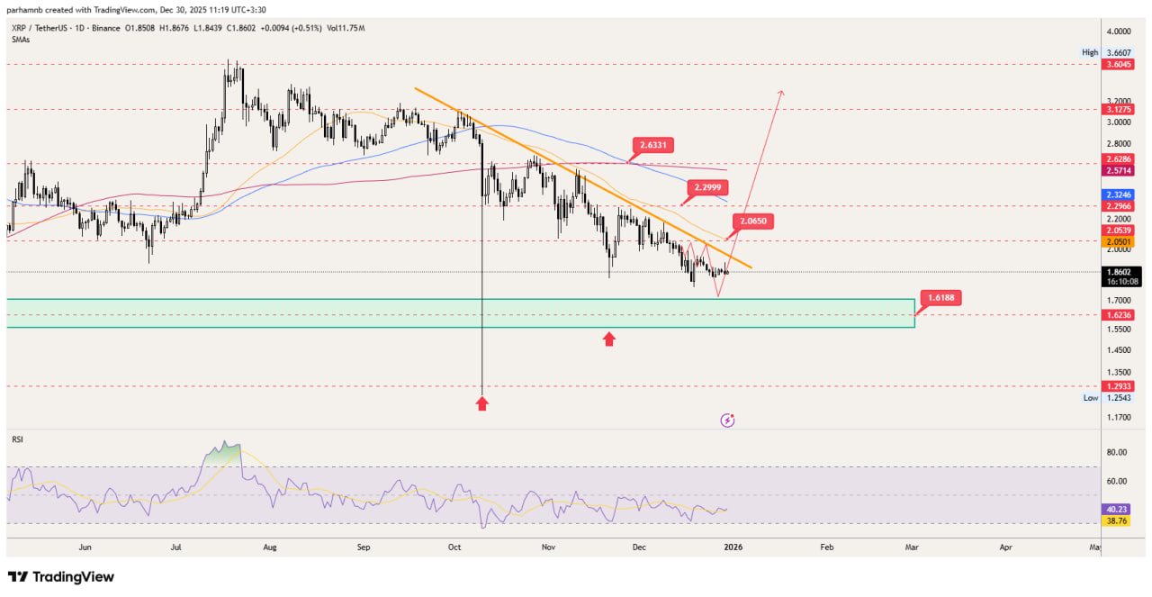 بررسی نمودار روزانه نشان میدهد قیمت زیر مقاومت داینامیک قرار دارد و روندی کاهشی را طی میکند. با حفظ حمایت کلیدی در محدوده ۱.۶۱ دلار، انتظار میرود XRP توانایی افزایش تقاضا را داشته باشد و با شکست مقاومت داینامیک، به سمت سطوح مقاومتی بالاتر حرکت کند.