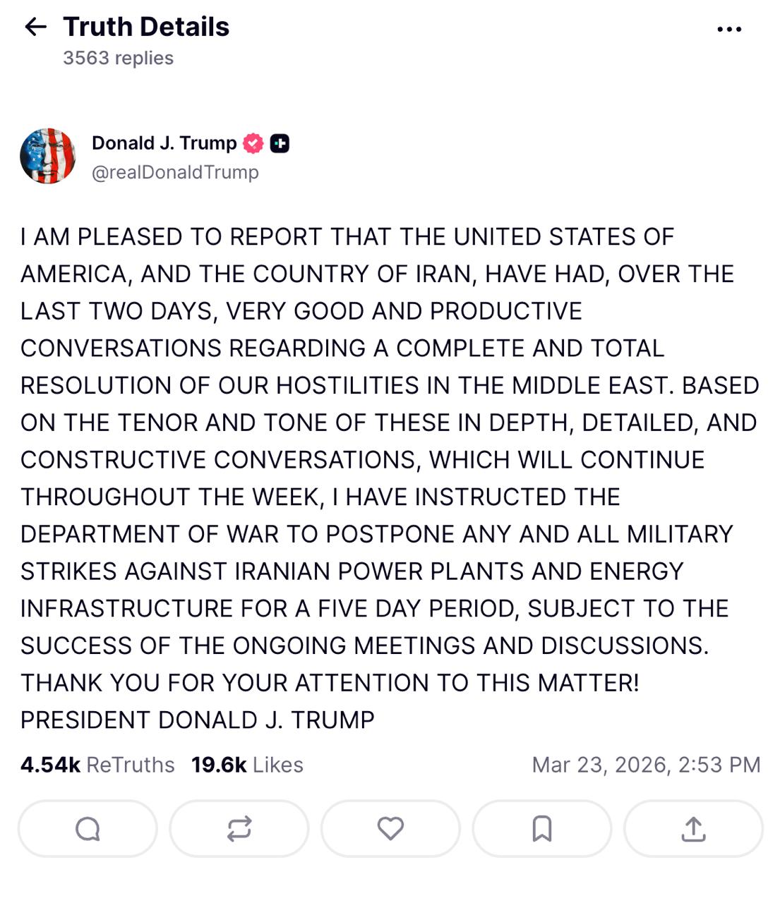 ترامپ در شبکه‌ی Truth Social اعلام کرد به وزارت جنگ دستور داده است حملات نظامی علیه نیروگاه‌ها و زیرساخت‌های انرژی ایران را به مدت پنج روز به تعویق بیندازد. او این تصمیم را نتیجه‌ی گفت‌وگوهای بسیار خوب و سازنده‌ی دو روز گذشته بین ایالات متحده و ایران دانست و تاکید کرد این مذاکرات در طول هفته ادامه خواهد داشت.
