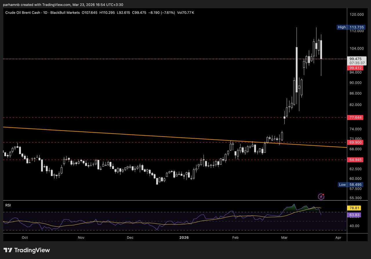 با نگاه به نمودار نفت در تایم روزانه، مشخص است که بازار پس از انتشار خبر تعلیق پنج‌روزه‌ی حملات به زیرساخت‌های انرژی ایران با موجی از فشار فروش روبه‌رو شد. قیمت امروز نفت، که پیش از انتشار خبر حوالی ۱۱۰ دلار معامله می‌شد، در واکنش به این خبر تا محدوده‌ی ۹۲ دلار عقب نشست و اکنون حوالی ۹۹ دلار نوسان می‌کند.