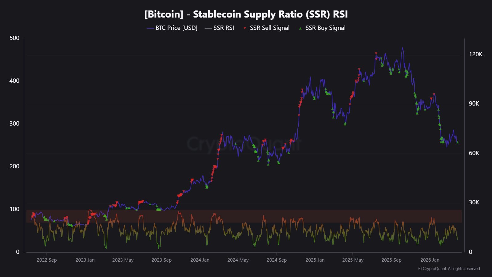 همانطور که این تحلیلگر در پست دیگری اشاره کرد، شاخص قدرت نسبی (RSI) مربوط به SSR بیت کوین اخیراً به منطقه سبز کاهش یافته است. مارتون بر اساس این روند توضیح داد: «هنوز مقدار زیادی نقدینگی استیبل کوین نسبت به ارزش بازار بیت کوین وجود دارد که نشان میدهد قدرت خرید همچنان در حاشیه بازار باقی مانده است.»