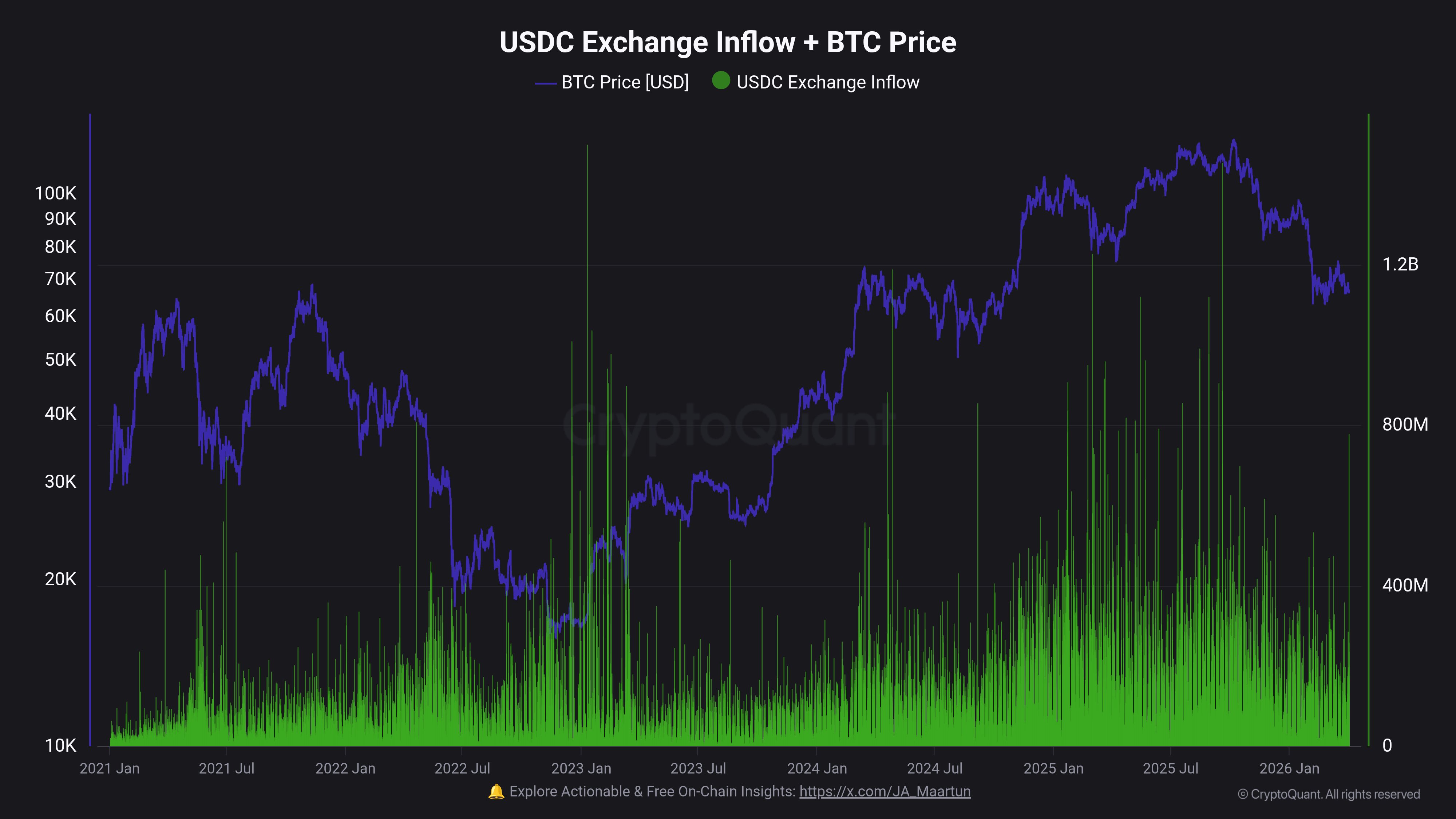 مارتون (Maartunn)، تحلیلگر جامعه کریپتوکوانت، در پستی جدید اعلام کرد که شاخص ورود به صرافیها برای استیبل کوین سیرکل (Circle) یعنی یو اس دی کوین، اخیراً جهش قابل توجهی داشته است.