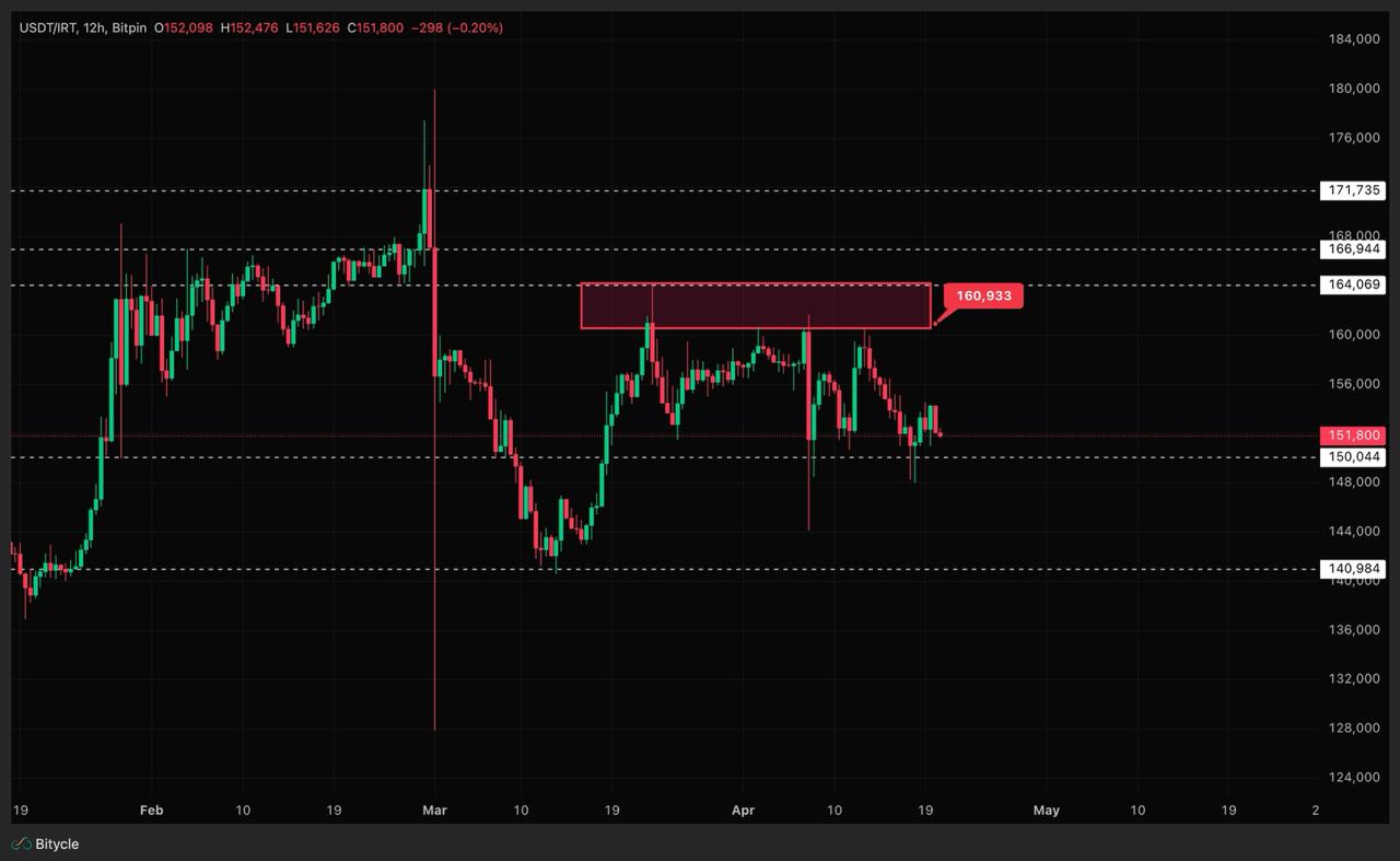 با توجه به نمودار ۱۲ ساعته، تتر پس از رسیدن به نزدیکی ۱۶۰ هزار تومان وارد روند نزولی شد و در ادامه تا محدوده ۱۴۷ هزار تومان اصلاح کرد. این رفتار نشان می‌دهد بازار بعد از موج صعودی قبلی، در حال تخلیه بخشی از هیجان و پرمیوم جنگی بوده است.