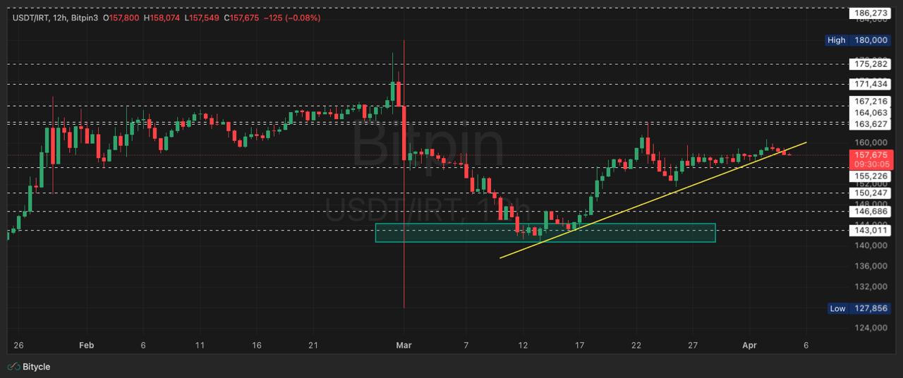 در سمت دیگر، طبق نمودار، تتر در حال شکستن حمایت داینامیک کوتاهمدت (خط زرد) به سمت پایین است. این نشانه از منظر تکنیکال میتواند به معنی تضعیف مومنتوم صعودی کوتاهمدت باشد، مخصوصاً اگر شکست خط روند با کندلهای قویتر و تثبیت همراه شود. در چنین حالتی، اگر ۱۵۵ هزار تومان هم از دست برود، سناریوی اصلاح عمیقتر فعالتر میشود و میتوان انتظار کاهش بیشتر را داشت.