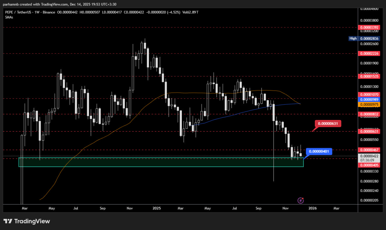 با بررسی نمودار قیمت پپه مشاهده میشود که این رمزارز به یک محدوده حمایتی مهم رسیده است. در صورتی که این حمایت هفتگی حفظ شود، انتظار میرود پپه وارد فاز نوسانات صعودی شود. در این سناریو، اهداف قیمتی میتوانند بهتدریج در سطوح مقاومتی بالاتر که در نمودار مشخص شدهاند فعال شوند.