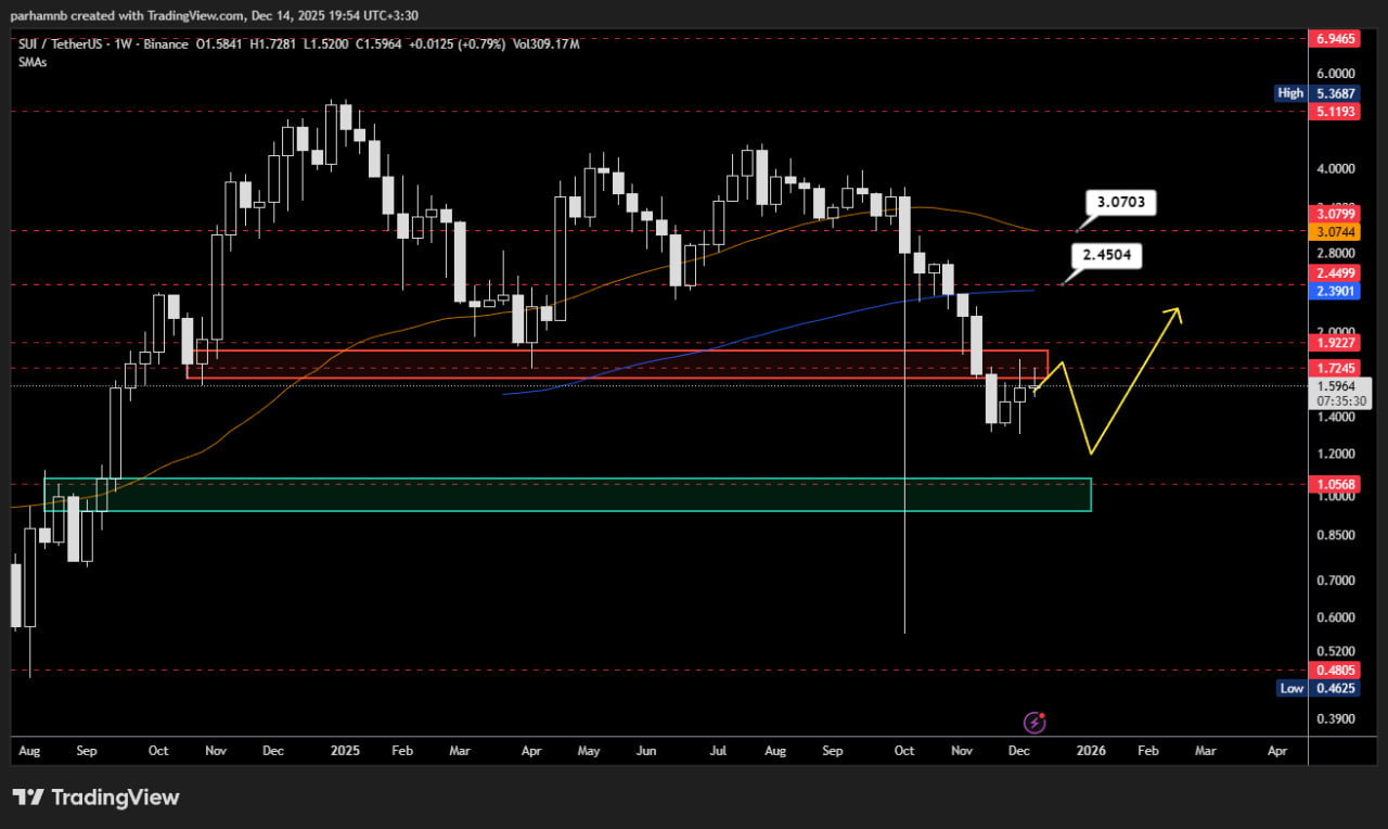نمودار هفتگی قیمت سویی نشان میدهد که این رمزارز زیر محدوده مقاومتی بسیار مهم (باکس قرمز) قرار دارد. نکته کلیدی در ساختار فعلی SUI، حمایت بسیار مهم ناحیه ۱ دلار است که در نمودار با باکس سبز رنگ مشخص شده و تا زمانی که قیمت بالای این حمایت نوسان کند، سناریو همچنان صعودی ارزیابی میشود.