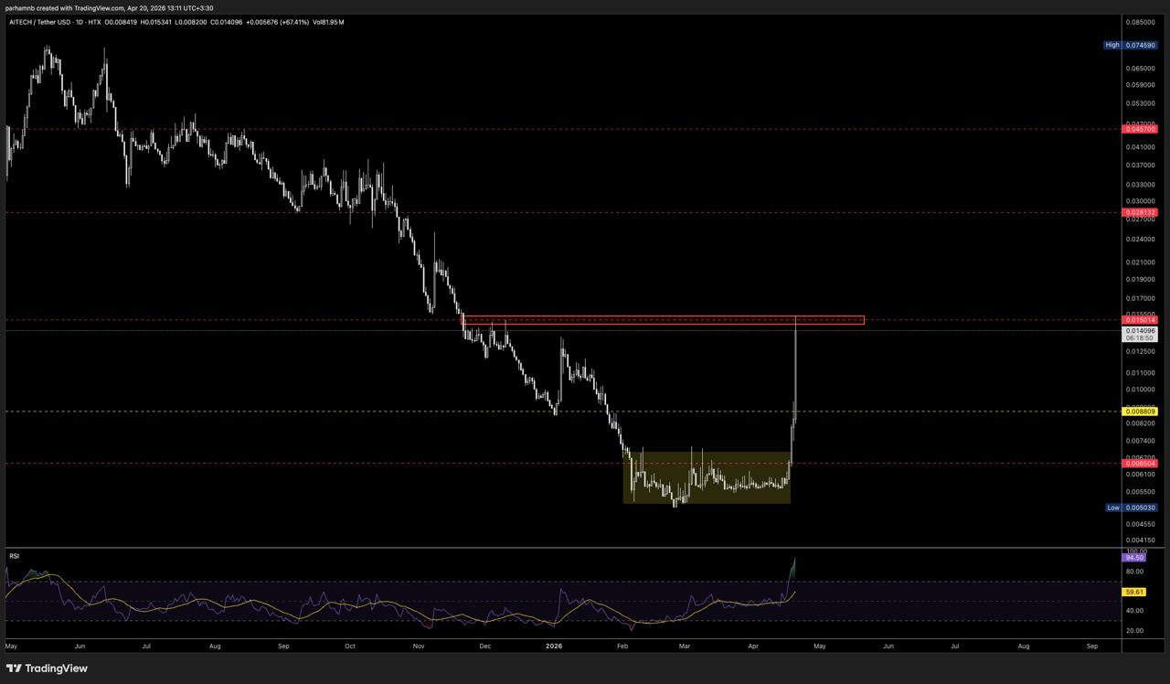 با بررسی قیمت ای آی تک متوجه میشویم که پس روند نزولی سخت و سنگین، در محدوده ۰.۰۰۵۰ دلار یک کفسازی قابلتوجه انجام داد و از همان نقطه با رشد و پامپ قیمت، بیش از ۱۶۰ درصد صعود کرد.
