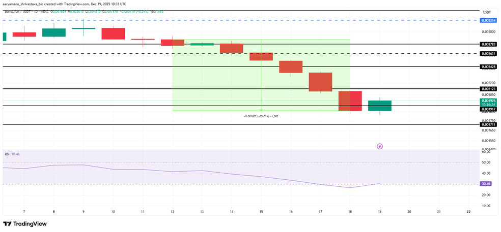 توکن PUMP این هفته یکی از بدترین عملکردها را در بین آلتکوینها داشته و بیش از ۳۵ درصد سقوط کرده و اکنون نزدیک ۰.۰۰۱۹۷ دلار معامله میشود، که نشانهای از فشار فروش سنگین و احساسات ضعیف در میان سرمایهگذاران است.
