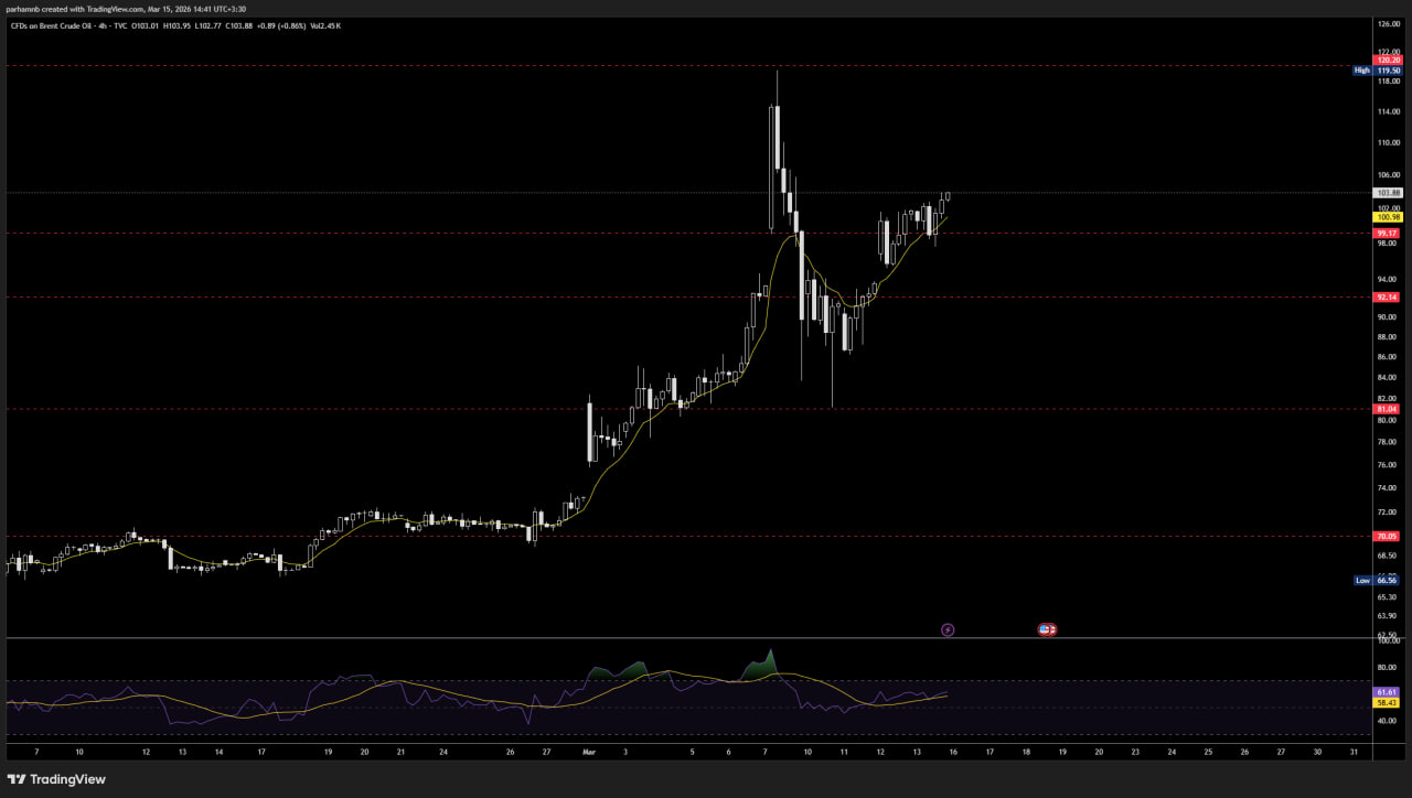 اما این اعداد، تصویر کاملی از هفته نمی‌دهند. در طول هفته، نفت خام یک‌بار تا نزدیکی ۱۲۰ دلار در هر بشکه جهش کرد و همین موضوع گپ‌های بزرگ صعودی و نزولی متعددی در بازار ایجاد کرد.